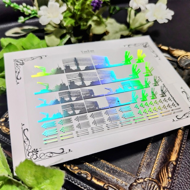 注意:まだ完璧に箔押しが出来てない為、1部欠けがある場合がありますご了承下さい。 レジンへ封入に使用する透明なシートになります(◍˃ ᵕ ˂◍) こちらは箔押しを行ったタイプになります! 既存の封入シートとは違い、レーザープリンターで印刷を行ったタイプになります 光の加減でシルバーをベースにオーロラ色に輝きます✩.*˚ ハサミやカッターなどで切って使用するタイプになります(シールでは無いのでご注意下さい) また白色部分は透明になります。 ~~~~~~~詳細~~~~~~~~~ 1シート 約10.5㎝ × 7.3cm 太い方眼1マス は1cmです(方眼マスは印刷されません) ~~~~~~~その他~〜〜〜〜〜〜 梱包は補強用厚紙を入れ、封筒での郵送予定です。(他の物もご購入の場合や枚数が10枚近い場合は小型ダンボール箱になる場合もあります) ~~~~~~~注意事項~~~~~~~ ※レジン封入シートですのでそれ以外の使用は保証できません。 ※箔押しを行っている為、強く擦ったり引っ張らないで下さい。 ※高温・高湿度の場所には置いとかないで下さい。 ※お子さんやペットの誤飲にはご注意下さい。 ※モニターにより多少 色や見え方が違う場合があります。